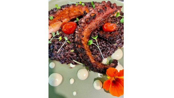 ARROZ ARBOREO, POLVO GRELHADO COM ALHO, FINALIZADO COM MOLHO DE ERVAS E QUEIJO PARMESÃO