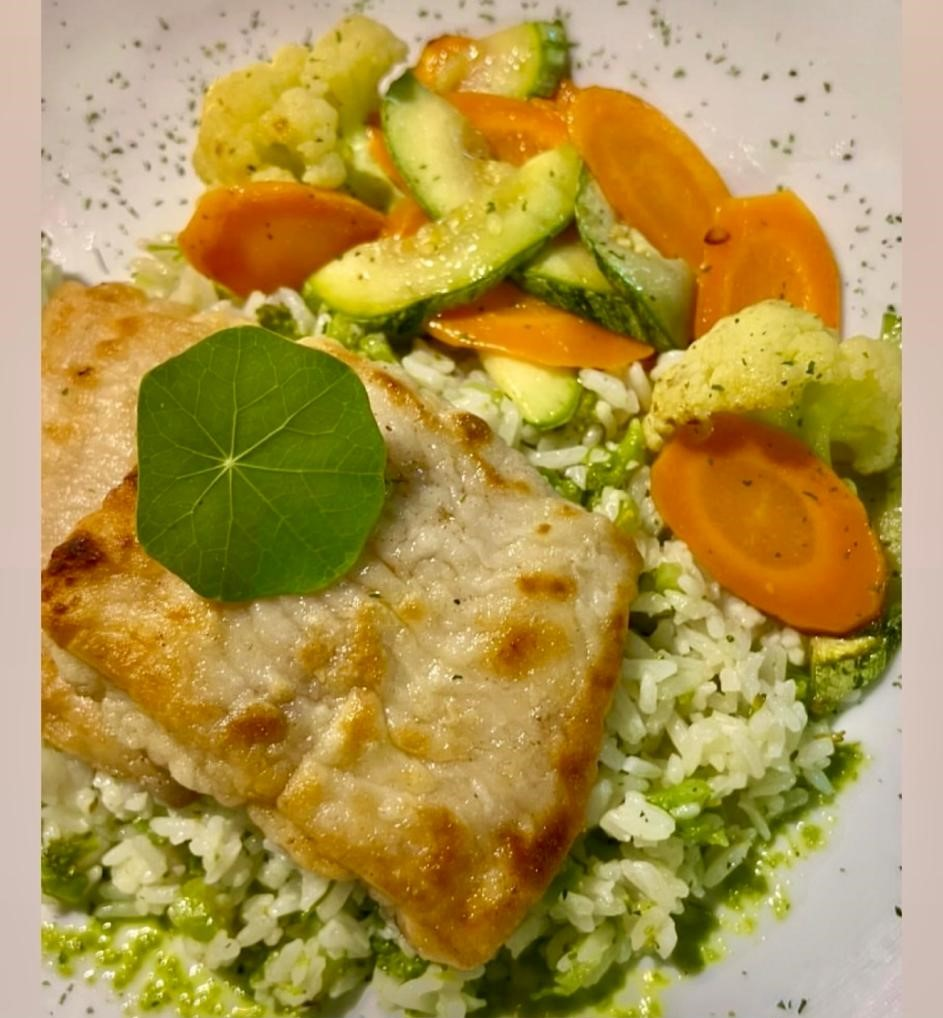 PEIXE BRANCO, ARROZ COM BRÓCOLIS E LEGUMES SALTEADOS NA MANTEIGA
