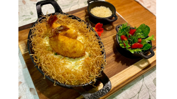 ARROZ ARBOREO COM ESPECIARIAS, CAMARÃO REFOGADO COM ERVILHAS FRESCAS ACOMPANHA 2 CAMARÕES RECHEADOS DE CREAM CHEESE (PARA UMA PESSOA)