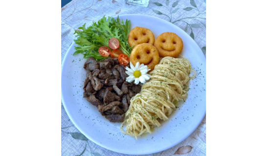MIGNON PICADINHO ACOMPANHADO DE MACARRÃO ESPAGUETE, BATATA SMILE E SALADA (INFANTIL)