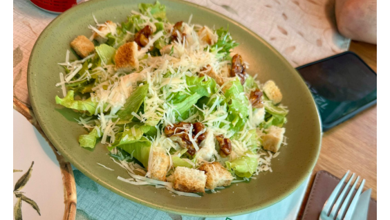MIX DE FOLHAS, CRUTONS, FRANGO GRELHADO DESFIADO, RASPAS DE PARMESÃO E MOLHO CAESAR