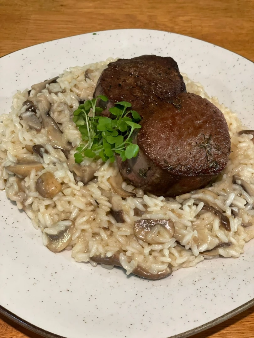 MIGNON GRELHADO NO AZEITE E ERVAS, RISOTO DE COGUMELOS FRESCOS FINALIZADO COM NATA E PARMESÃO
