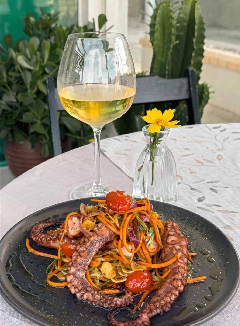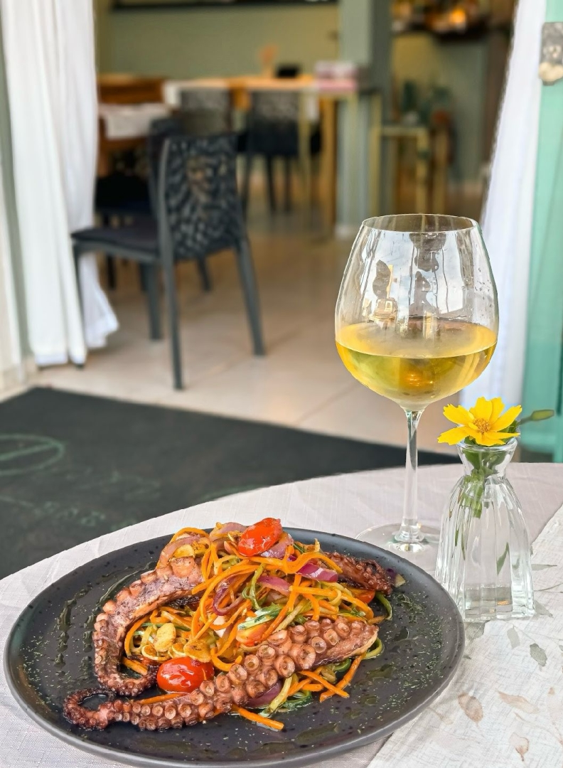 QUATRO TENTACULOS GRELHADOS NO AZEITE DE ERVAS, ALHO LAMINADO, CEBOLA ROXA E LEGUMES
