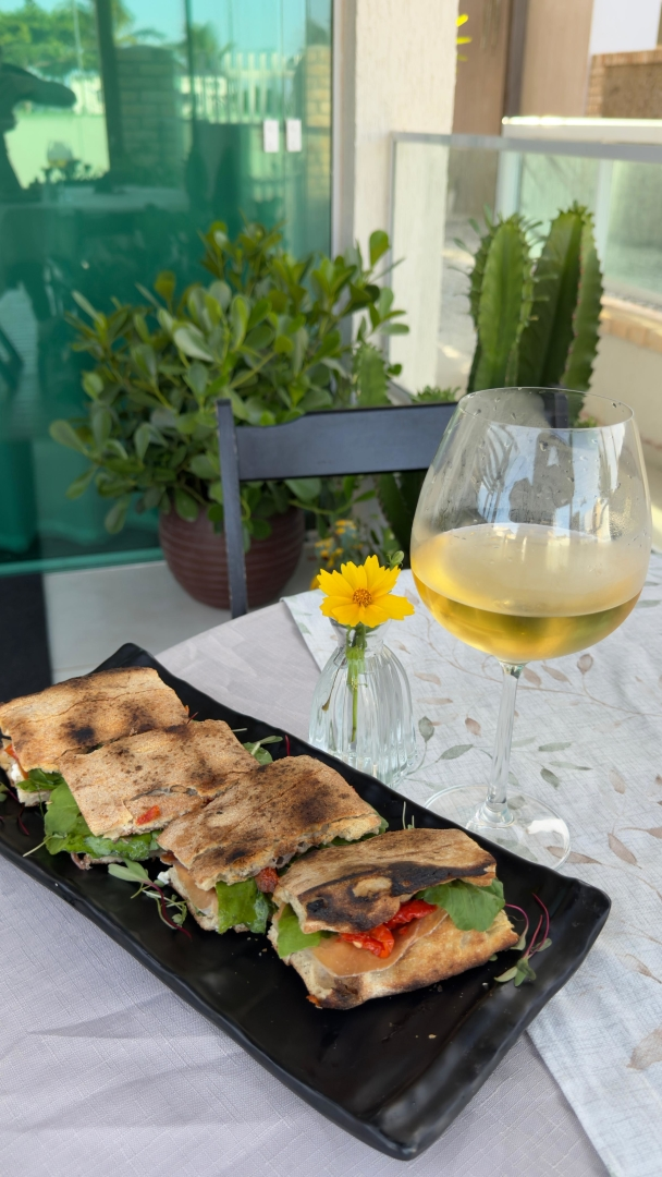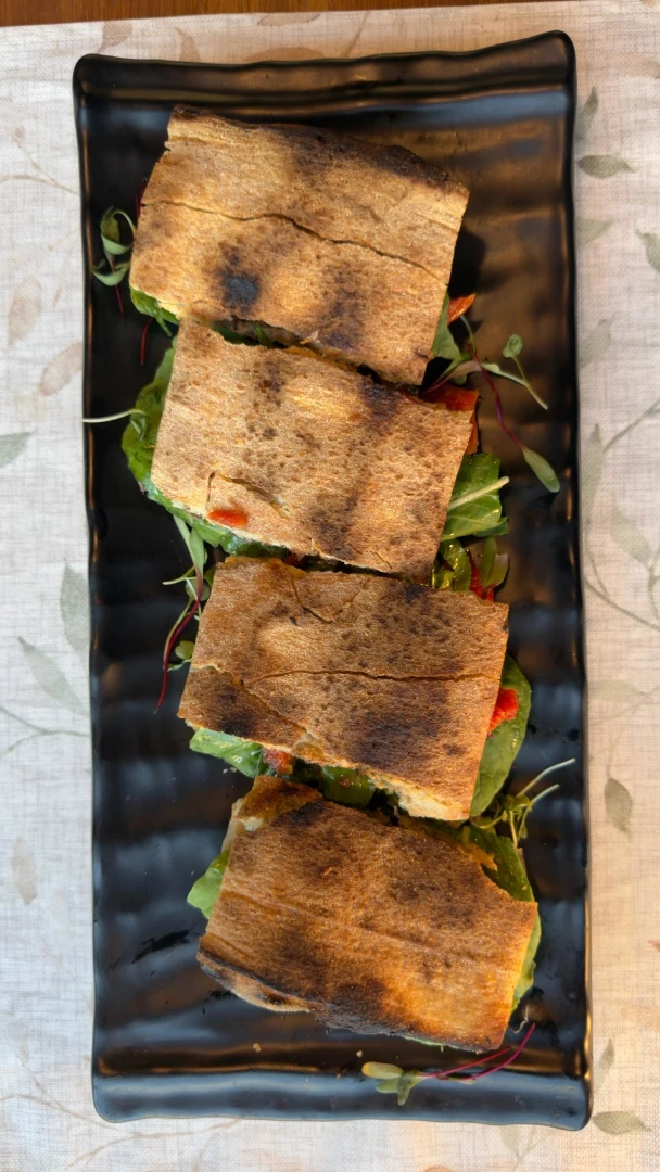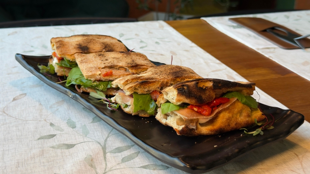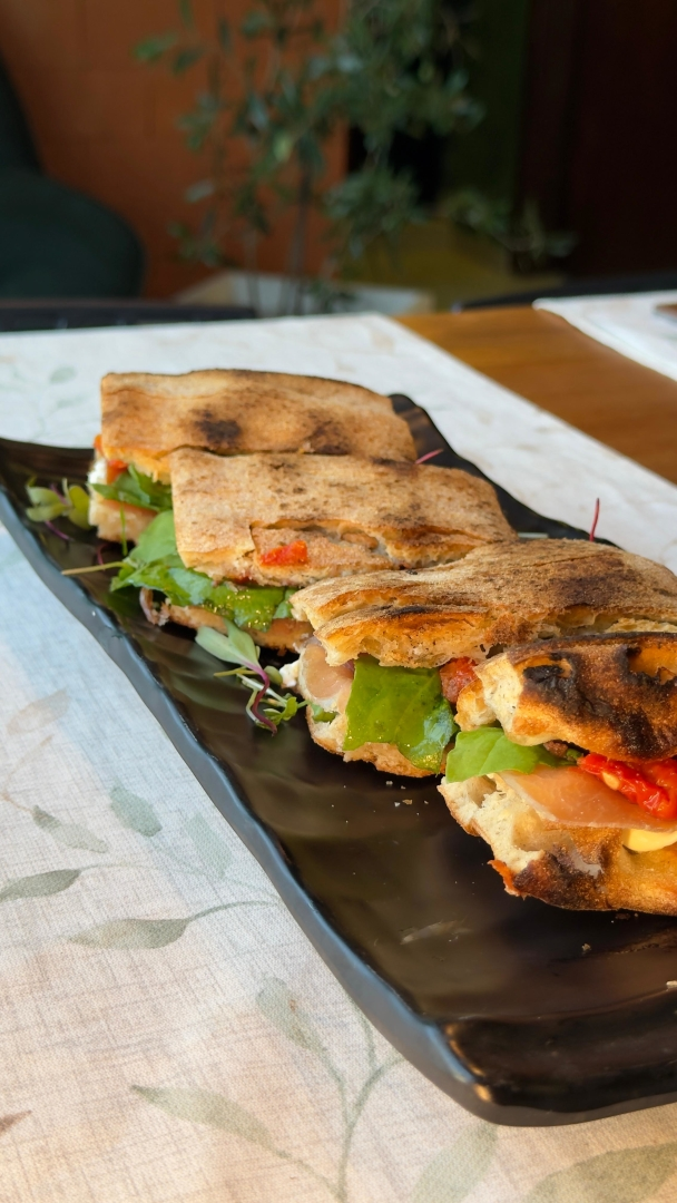 TORRADAS ITALIANAS COM MUSSARELA DE BÚFULA, MOLHO PESTO E TOMATE CONFIT - 2 unidades.